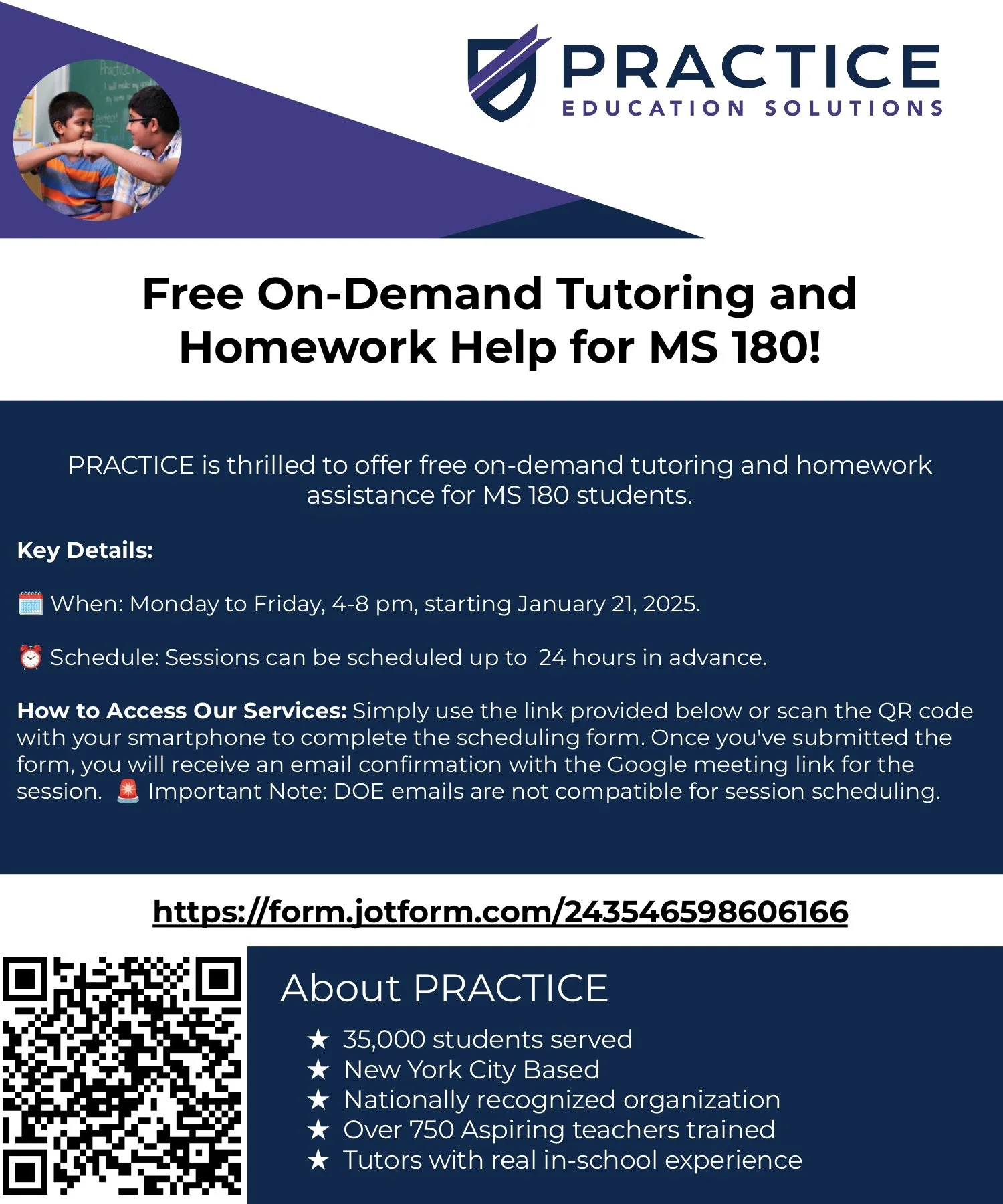 The staff, students, parents and community of Middle School 180 are devoted to academic excellence and the cultivation of individual strengths and talents in a clean, safe and supportive environment where individual differences and respect for the rights of others guide school and community behavior.